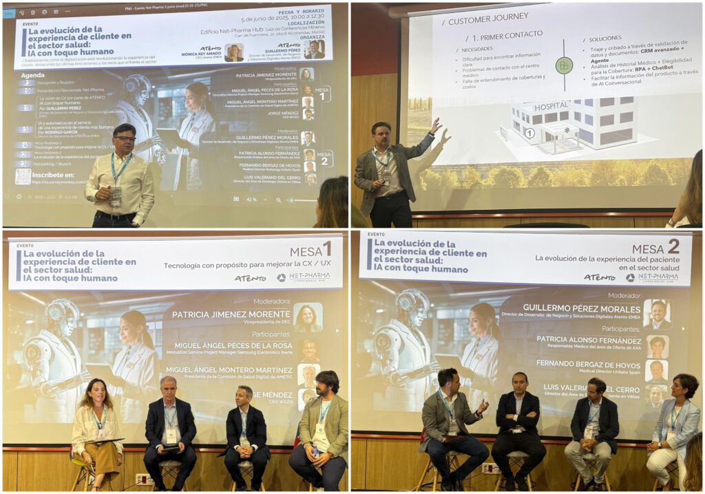Hoy hemos tenido el privilegio de asistir al evento «La evolución de la experiencia de cliente en el sector salud: IA con toque humano», celebrado en el espacio Net-Pharma Hub y organizado por el equipo de Atento.